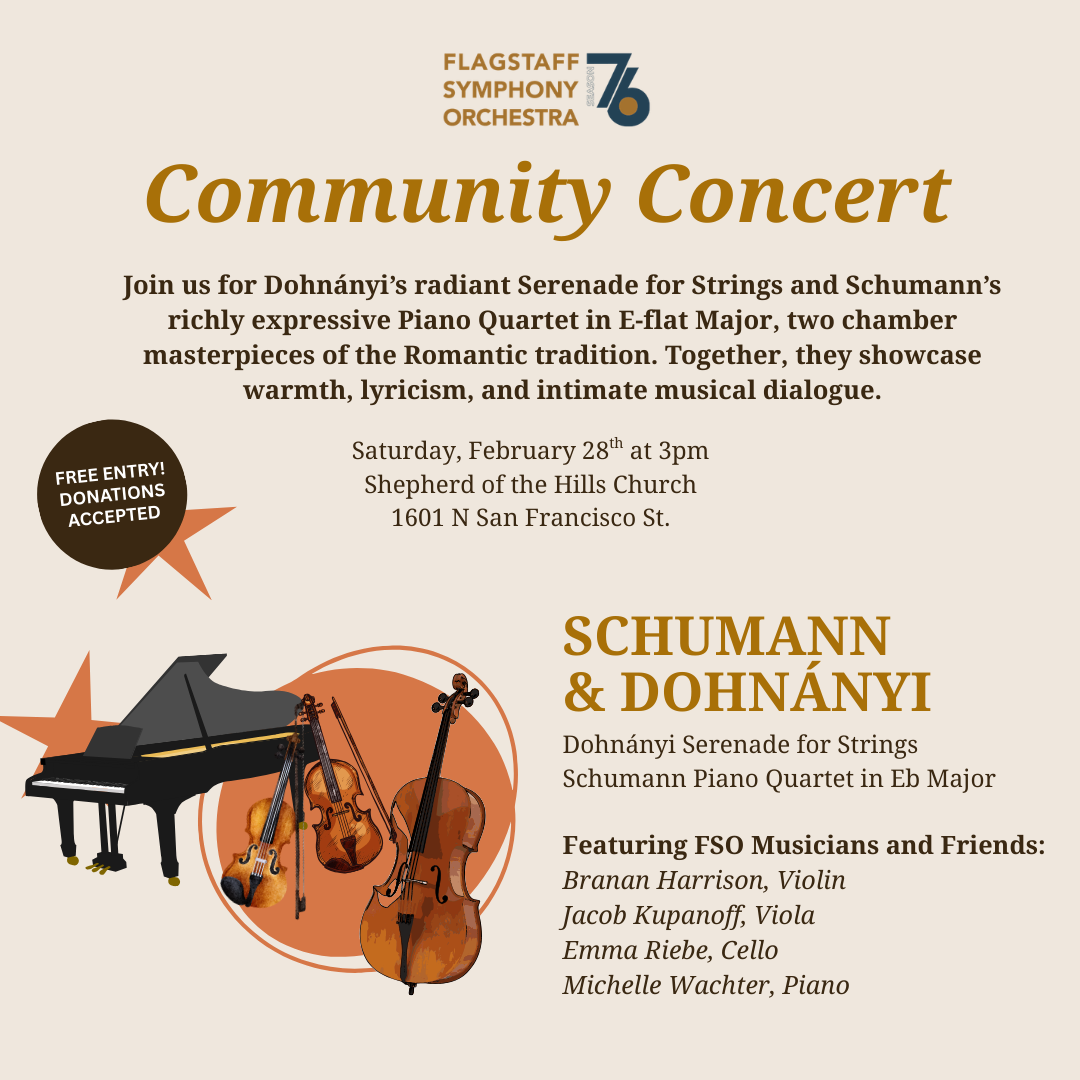 At 3pm on Saturday, February 28th at Shepherd of the Hills Church, enjoy a concert by FSO musicians and friends: Branan Harrison, Violin, Jacob Kupanoff, Viola, Emma Riebe, Cello, and Michelle Wachter, Piano. Experience Dohnányi’s radiant Serenade for Strings and Schumann’s richly expressive Piano Quartet in E-flat Major.