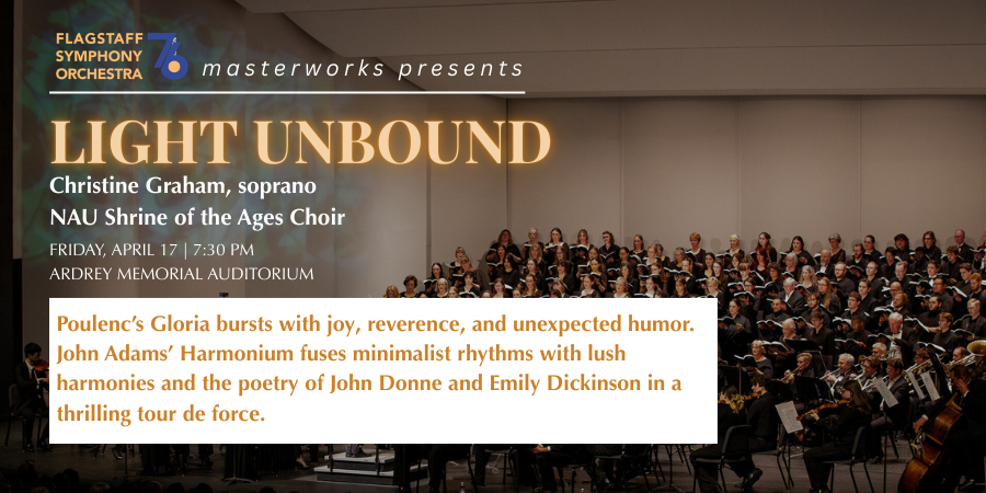 Mark those calendars for our season finale concert, Light Unbound. The concert features two monumental choral works filled with color and spirit. Poulenc’s Gloria bursts with joy, reverence, and unexpected humor. John Adams’s Harmonium fuses minimalist rhythms with lush harmonies and the poetry of John Donne and Emily Dickinson in a thrilling tour de force.